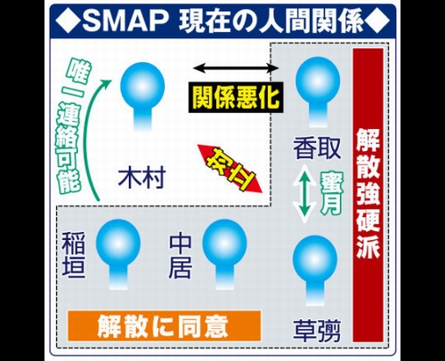 ●SMAPが2016年12月31日をもって解散 Category:残念。 Date:2016年08月14日 いつもSMAPをご支援頂き、有難うございます。これまで皆様に大変なご心配をおかけしておりましたSMAPの今後の活動につきましてメンバーと協議を重ねた結果をご報告させていただきます。またメンバーの意思を尊重し、書面でのお知らせとなりましたことをお許しください。デビューより25年間アーティストとしてグループ活動をして参りましたSMAPは2016年12月31日を持ちまして解散させていただくことになりました。本年1月にSMAPメンバーより事務所に残りグループ活動を存続させたいという意向を受け、事務所一丸となってSMAPをサポートするべく各部署で様々な準備を進め、2月より8月10日まで半年以上の時間をかけて個々のメンバー並びに全員と面談を重ね、例年通りの音楽番組への出演、ファンへの感謝をこめたコンサートの開催、協議を進めてまいりました。しかしながら議論を続ける中で「今の5人の状況ではグループ活動をすることは難しい」というメンバー数名からの要望を受け、7月の音楽特番を辞退させていただいた経緯がございました。8月に入り、待っていてくださる方々のためにも、落ち着いて考える時間を持ち、前向きな状況が整うまでグループ活動をしばらく休むことを提案致しましたが、メンバー数名より「休むより解散したい」という希望が出たことを受け、苦渋の選択ではございますが、これまで一生懸命に走り続けた彼らの功績を尊重し、全員一致の意見ではないものの解散したいと考えるメンバーがいる状況でのグループ活動は難しいと判断し、本日のご報告となりました。25周年のコンサートやイベントを待ち望み応援してくださっているファンの皆さま、そして彼らを今日まで支えてくださった関係者の皆さまのご期待に応えることができず本当に心苦しく、私どもの力不足をお詫び申し上げます。誠に申し訳ございません。本年を持ちましてSMAPは解散させていただくことになりますが5人それぞれの所属が変わることはなく、より一層個人活動につきましては精進して参ります。彼らの活動を、これまで同様温かく見守っていただけましたら幸いです。今後ともご支援とご鞭撻のほど、何卒よろしくお願い申し上げます。株式会社ジャニーズ事務所 SMAPメンバーのコメント ▼中居正広 ファンの皆さま、関係各位の皆さま、我々SMAPが解散する事をご報告させていただきます。ご迷惑をお掛けしました。ご心配をお掛けしました。お世話にもなりました。このような結果に至ったことをお許しください。申し訳…ありませんでした…。▼木村拓哉 このたびの「グループ解散」に関して、正直なところ本当に無念です。でも、25周年のライブもグループ活動も5人そろわなければ何もできないので、のみ込むしかないのが現状です。沢山の気持ちで支えてくださったファンの方々、スタッフの皆さんを無視して「解散」という本当に情けない結果になってしまいました。今は言葉がうまく見つかりません。▼稲垣吾郎 ファンの皆さま、スタッフ関係者の皆さま、このたびはご心配ご迷惑をお掛けして本当に申し訳ございません。今の状況で5人での活動は難しいと思い、つらい決断ではありますが「解散」という形を取らせていただくことになりました。どうか僕たちの意思をご理解いただけたらと思います。28年間本当にありがとうございました。▼草なぎ剛 このたび僕たちSMAPは解散する道を選びました。いつも応援してくれたファンの皆さま、支えてくれた関係者の皆さま、グループ結成から28年間本当にありがとうございました。今後も精進して参りますので引き続き、温かく見守っていただけるとうれしく思います。▼香取慎吾 ファンの皆さま、そしてスタッフ関係者の皆さま。僕らSMAPは解散いたします。応援してくださったたくさんの方々に心より感謝申し上げます。そして突然のお知らせとなりましたこと、深くおわび申し上げます。 SMAP解散の内幕 香取が強く解散望む 中居は木村と対立も解散想定せず 国民的グループの解散劇はわずか2日間で決まった。電撃的決定の内幕で何が起きていたのか。真相に迫った。ジャニー社長が「冗談じゃない」とまで言った最悪の解散劇はなぜ起きてしまったのか。その鍵は2カ月前にあったジャニー社長とメンバーの面談の中身にある。テレビ局関係者によると、夏の音楽番組への出演を嫌がるメンバーにジャニー社長は「この年の僕が言ってるんだから」と懇願。「ファンも待ち望んでいるんだよ」と25周年コンサートもやるべきだと力を込めた。それでも木村拓哉(43)以外は首を縦に振らず、5人の足並みがそろうことはなかった。事務所トップの言葉に耳を貸さないのに、事務所には「残りたい」という態度に、メンバーの間に確執があることを理解していたスタッフも「わがままが過ぎる。さすがにひどい」と漏らすほどだった。この時点で活動再開の目は消えた。残った選択肢は活動