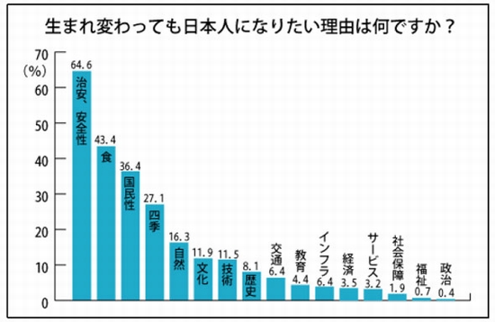 「生まれ変わっても日本人になりたい」と答えた人に、その理由を聞いたところ「治安、安全性」(64.6%)がトップ。次いで「食」(43.4%)、「国民性」(36.4%)、「四季」(27.1%)、「自然」(16.3%)と続いた。「治安・安全性」と答えた人からは「犯罪が少なく安心して暮らせるから」「テロや戦争が日常的に起こっていないから」といった声があった。