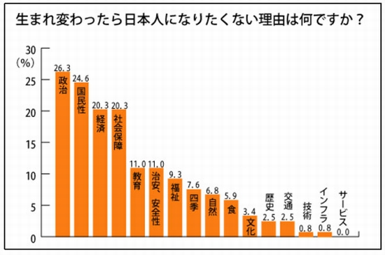 一方、「生まれ変わっても日本人になりたくない」と答えた人に、その理由を聞いたところ「政治」(26.3%)を挙げる人が最も多く、次いで「国民性」(24.6%)、「経済」「社会保障」(いずれも20.3%)だった。