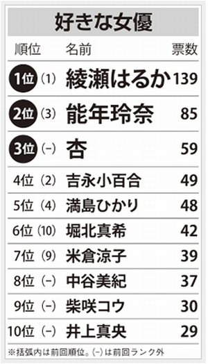 まず「好きな女優」部門でV5の金字塔を打ち立てたのが綾瀬はるか(29)。老若男女の幅広い支持層で、“無垢なる女王”の人気はもはや不動。昨年はドラマ「きょうは会社休みます。」(日本テレビ系)でのこじらせ女子役が話題に。