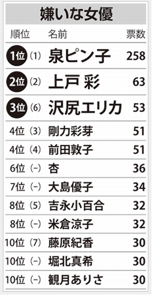 2位も前回と同じく上戸彩(29)。上戸もすっかり「嫌い」上位の常連になってしまった。