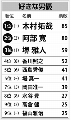 好きな男優で1位に輝いたのは、なんと圏外から急上昇した木村拓哉(42)。女性からの圧倒的な支持に加え、「HERO」(フジ系)続編の効果が大きかった。