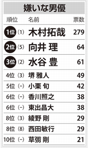 続いて嫌いな男優ランキングなのだが、こちらで1位になったのも不思議なことに木村拓哉。
